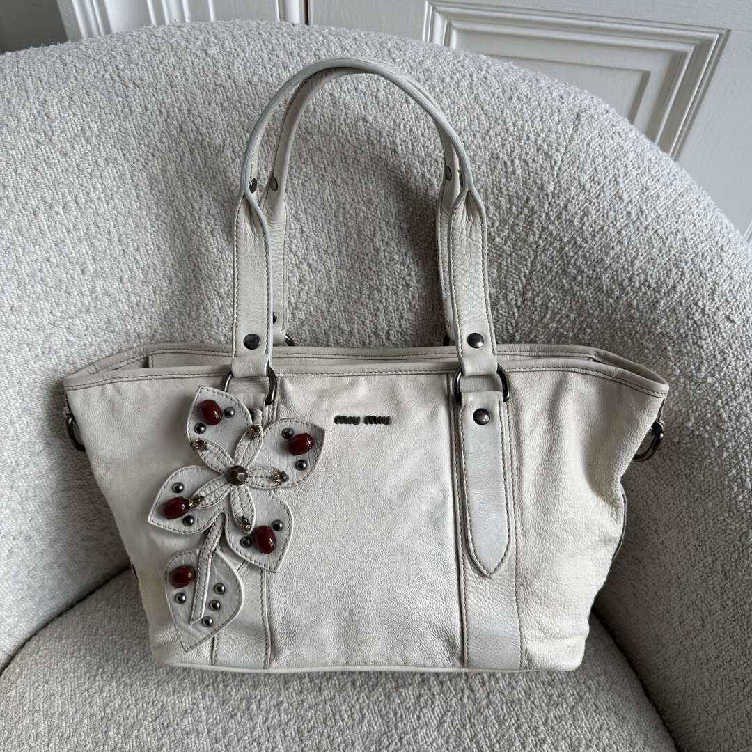 Expertly crafted from luxurious white leather, this 2000s Miu Miu handbag boasts a beautiful flower embellished design. With a convenient zip up compartment and adorned with the iconic silver Miu Miu spell out, this chic handbag effortlessly combines style and functionality for the modern woman.