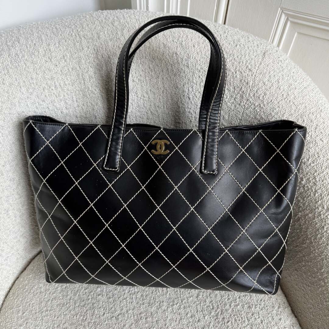 Expertly crafted from luxurious black quilted leather with bold white contrast stitching, the Chanel CC Wild Stitch Tote Bag combines classic elegance with modern style. The iconic gold CC logo adorns the front, while the spacious magnetic compartment houses a convenient zip-up pocket. Elevate any outfit with this timeless and practical accessory.