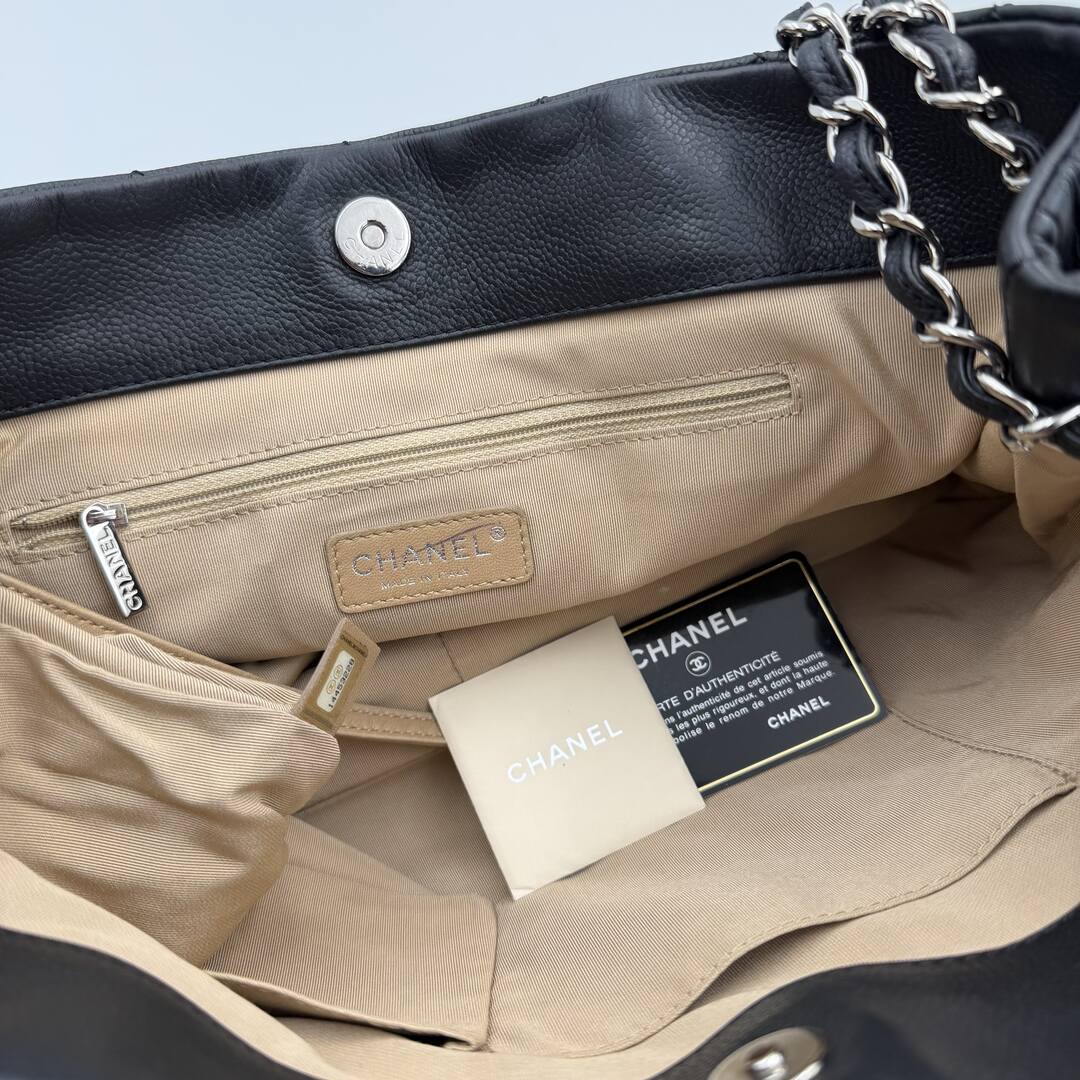 Crafted in supple black leather with the signature interlocking CC logo and quilted detailing. Features rolled handles and a chain-link shoulder strap for versatile carry options, complemented by silver-tone hardware. The interior boasts a grosgrain lining with three practical pockets and a secure snap closure. A timeless investment piece.