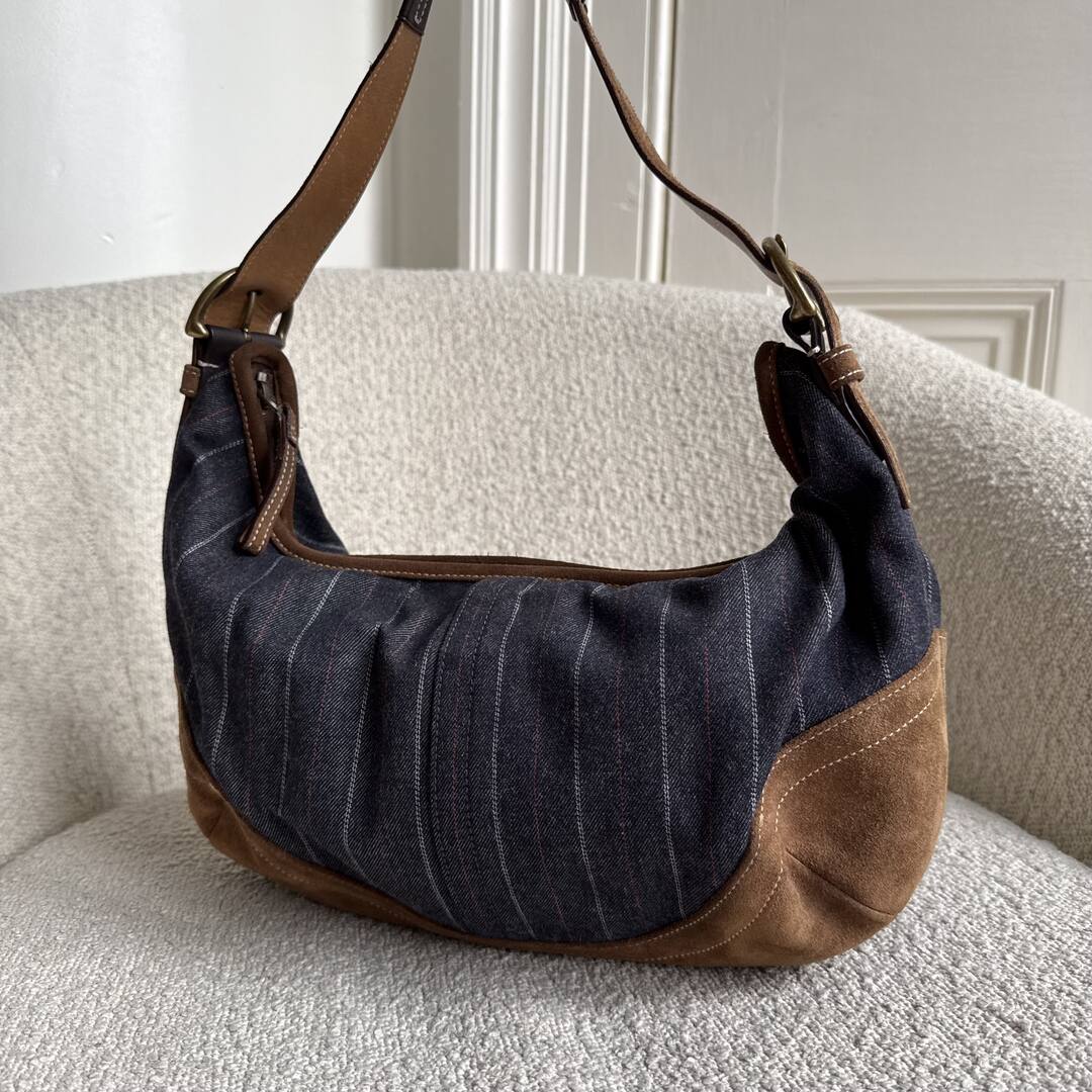 Coach Croissant hobo in striking blue denim canvas with rich brown leather accents. This shoulder bag combines casual elegance with practical functionality, featuring a secure zip-up compartment for valuables. The relaxed hobo silhouette offers comfortable everyday carry, while quality materials ensure lasting durability.