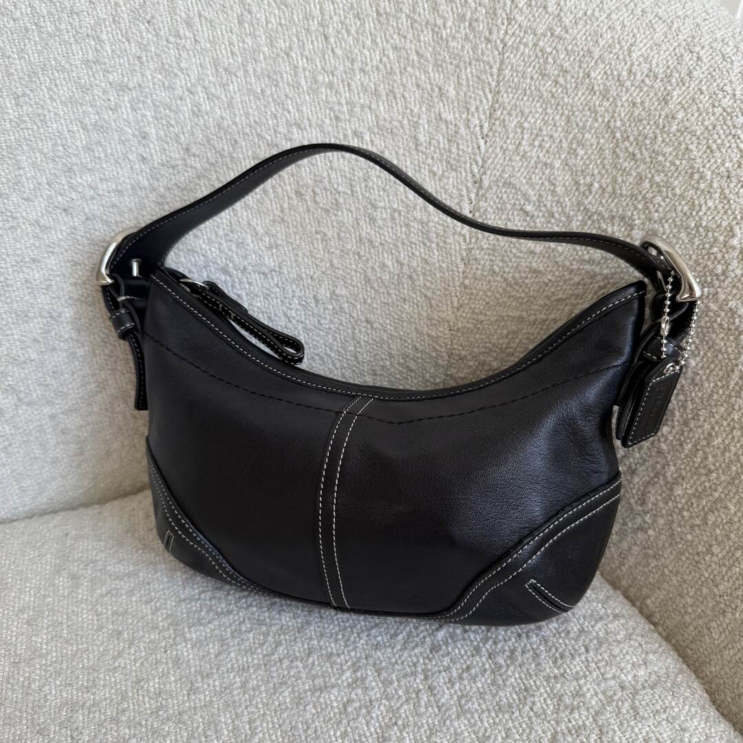Upgrade your style with the Coach Croissant Leather Black Shoulder Bag. Crafted with sleek black leather and a zip up compartment, this bag exudes sophistication. The iconic Coach charm attached adds a touch of elegance. Get yours today for a timeless addition to your wardrobe.