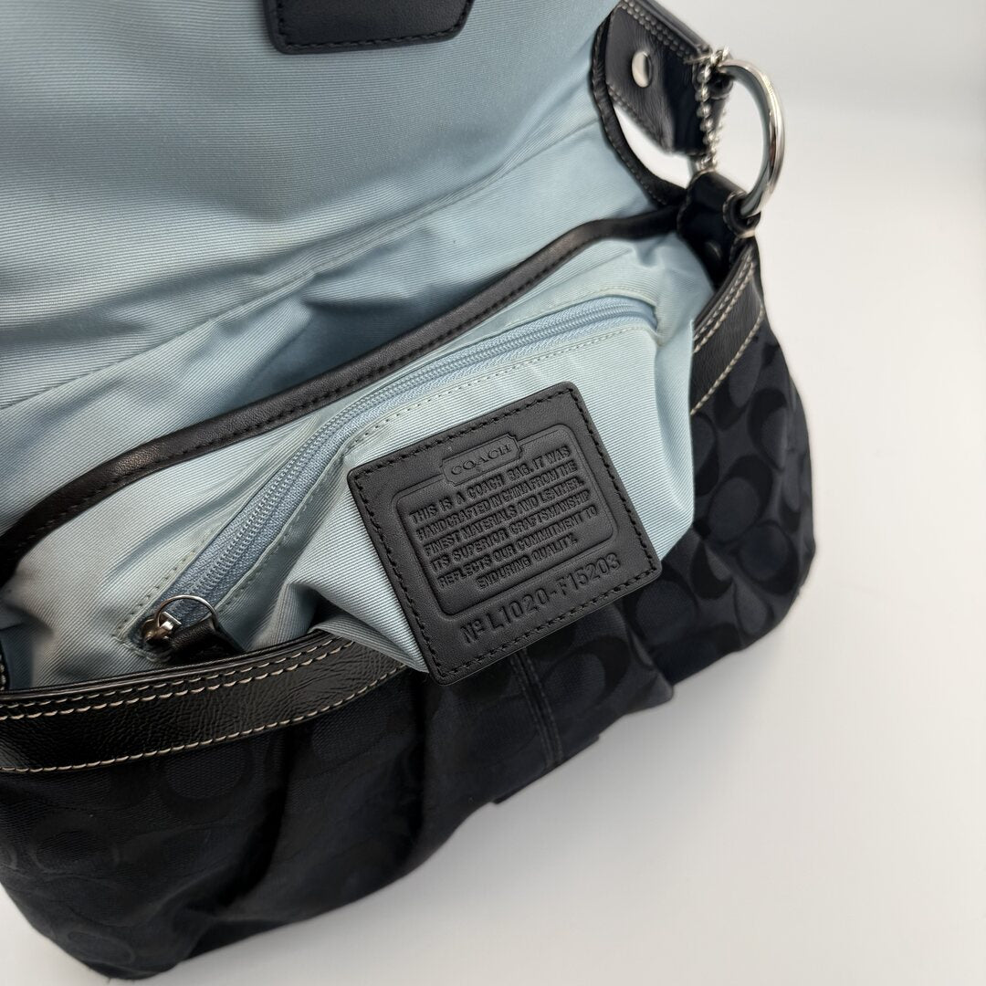 The Coach Soho Signature Black Shoulder Bag blends classic style with practical design. Crafted from black canvas featuring the iconic CC monogram, it is accented with a black leather braided silver buckle and subtle silver hardware. Inside, a magnetic compartment paired with a zip-up pocket ensures secure storage for your essentials, making this bag a refined and functional accessory for everyday use.