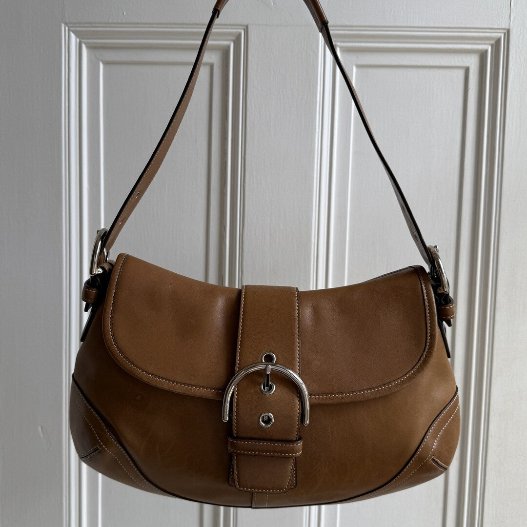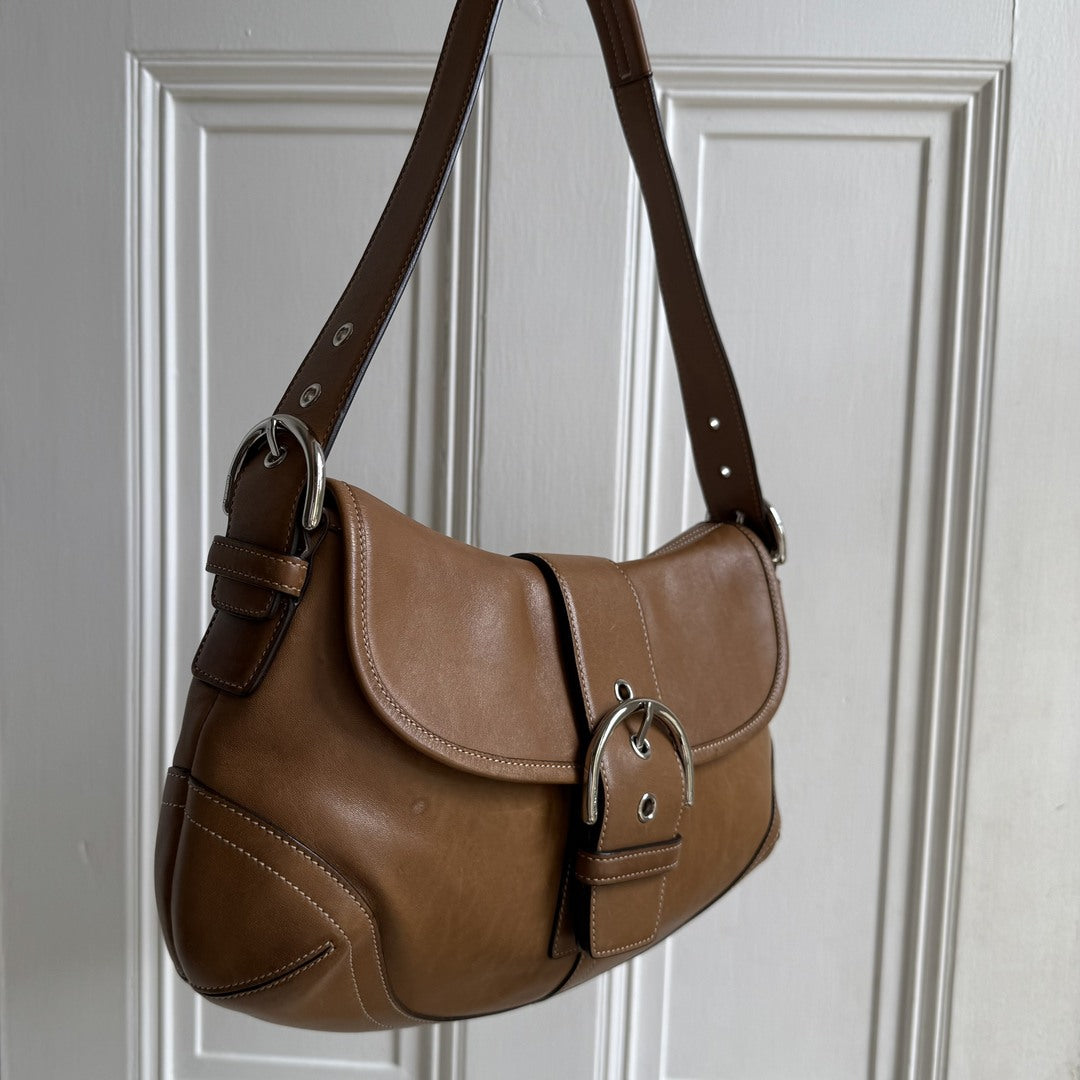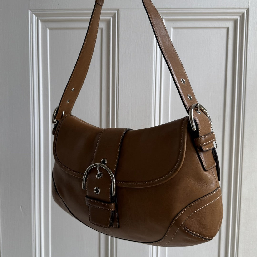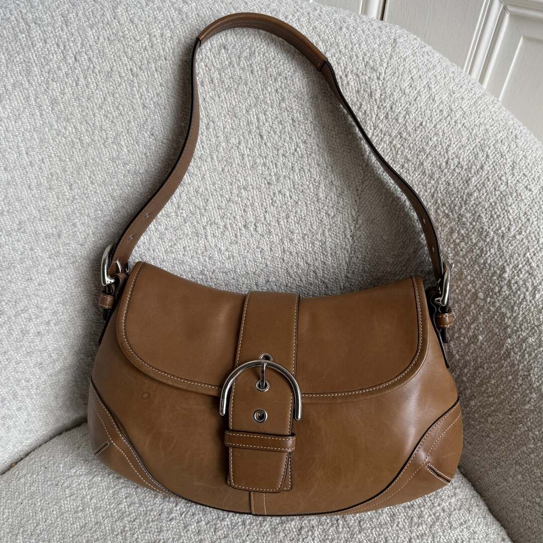 Expertly crafted from luxurious brown leather, the Coach Soho Shoulder Bag boasts a practical buckle design and magnetic compartment for easy access and security. Adorned with silver hardware and a signature Coach charm, this bag exudes style and sophistication.