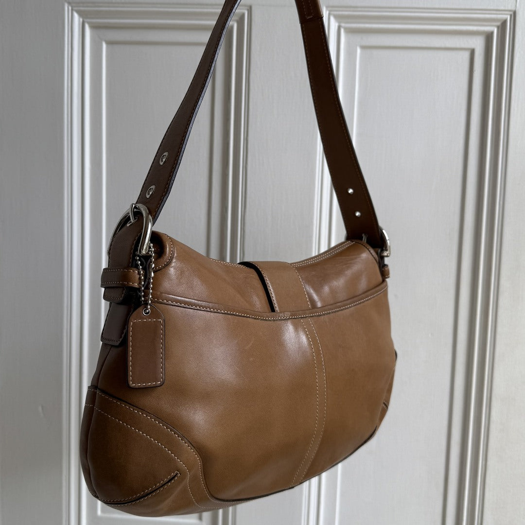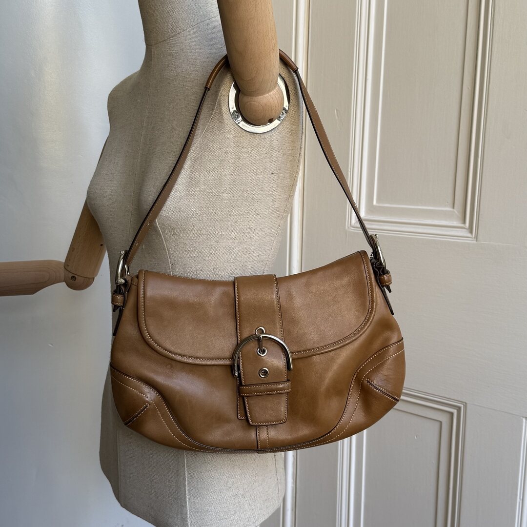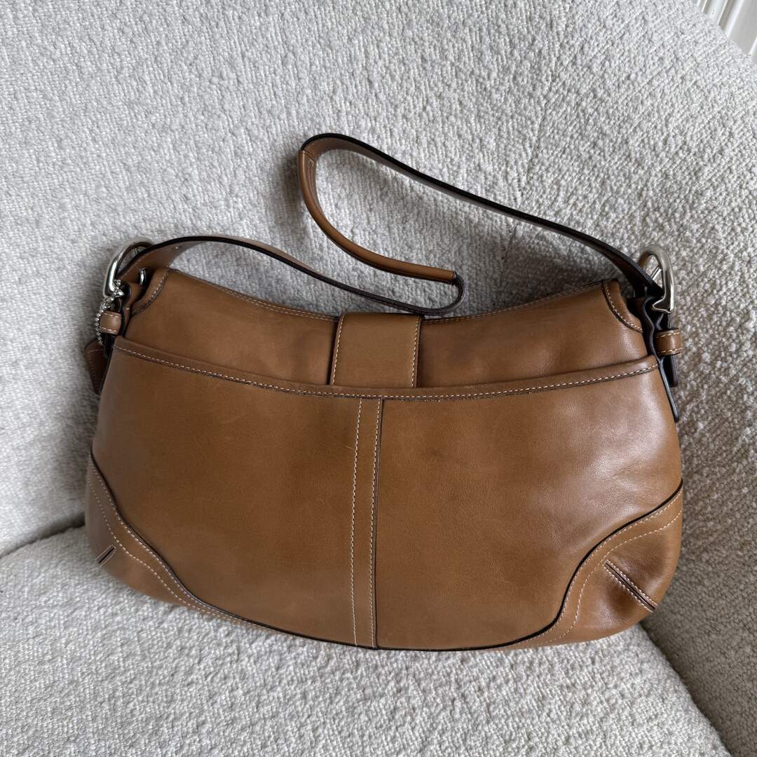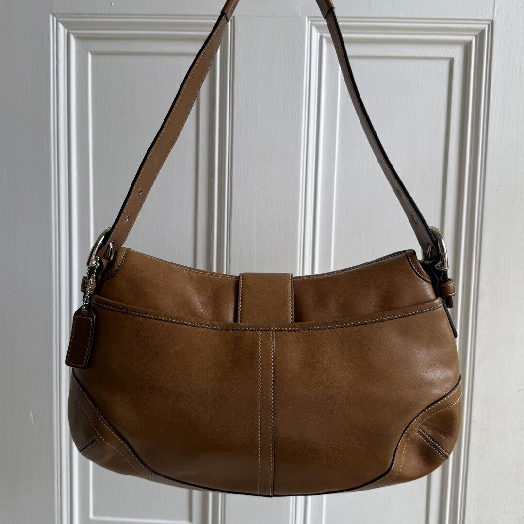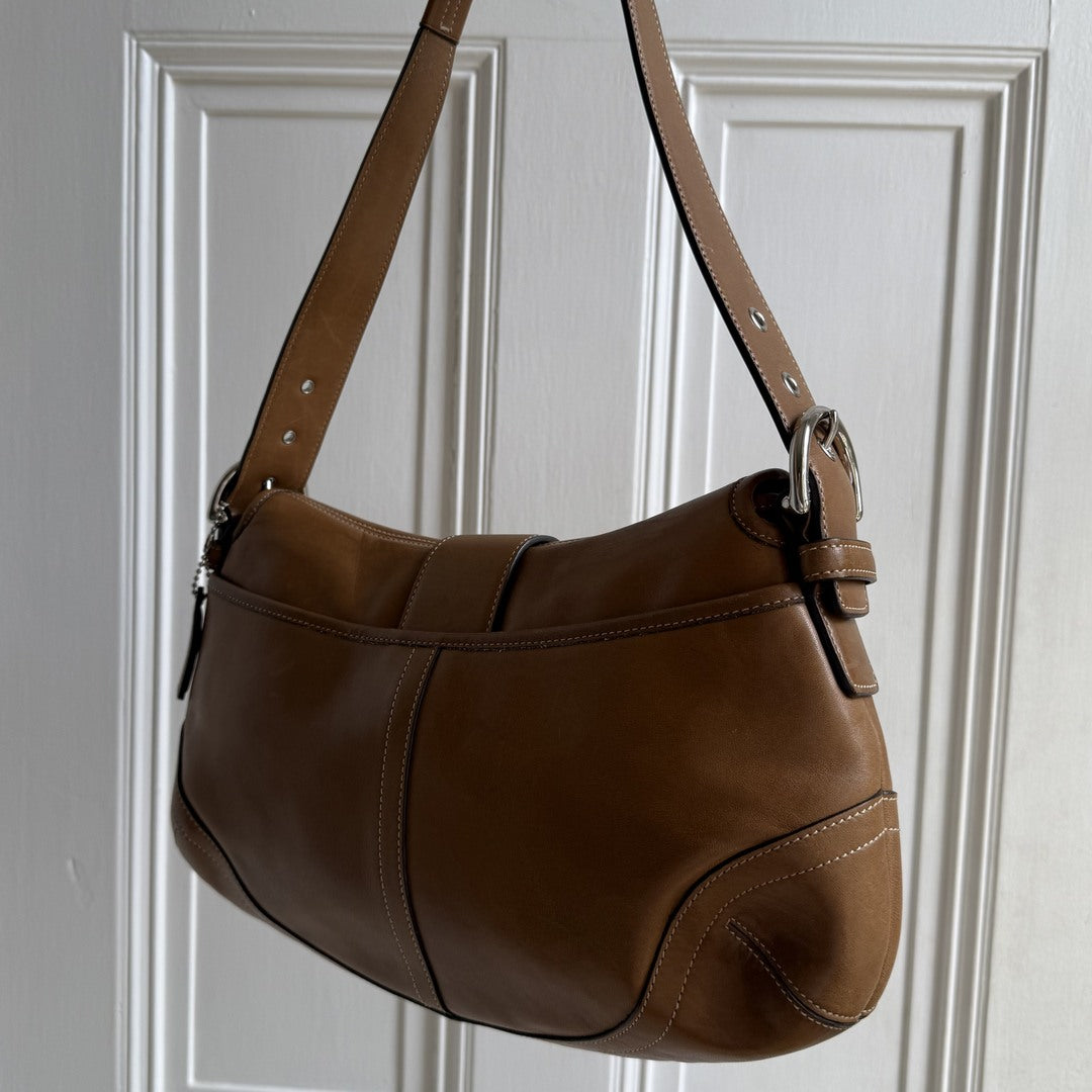 Expertly crafted from luxurious brown leather, the Coach Soho Shoulder Bag boasts a practical buckle design and magnetic compartment for easy access and security. Adorned with silver hardware and a signature Coach charm, this bag exudes style and sophistication.