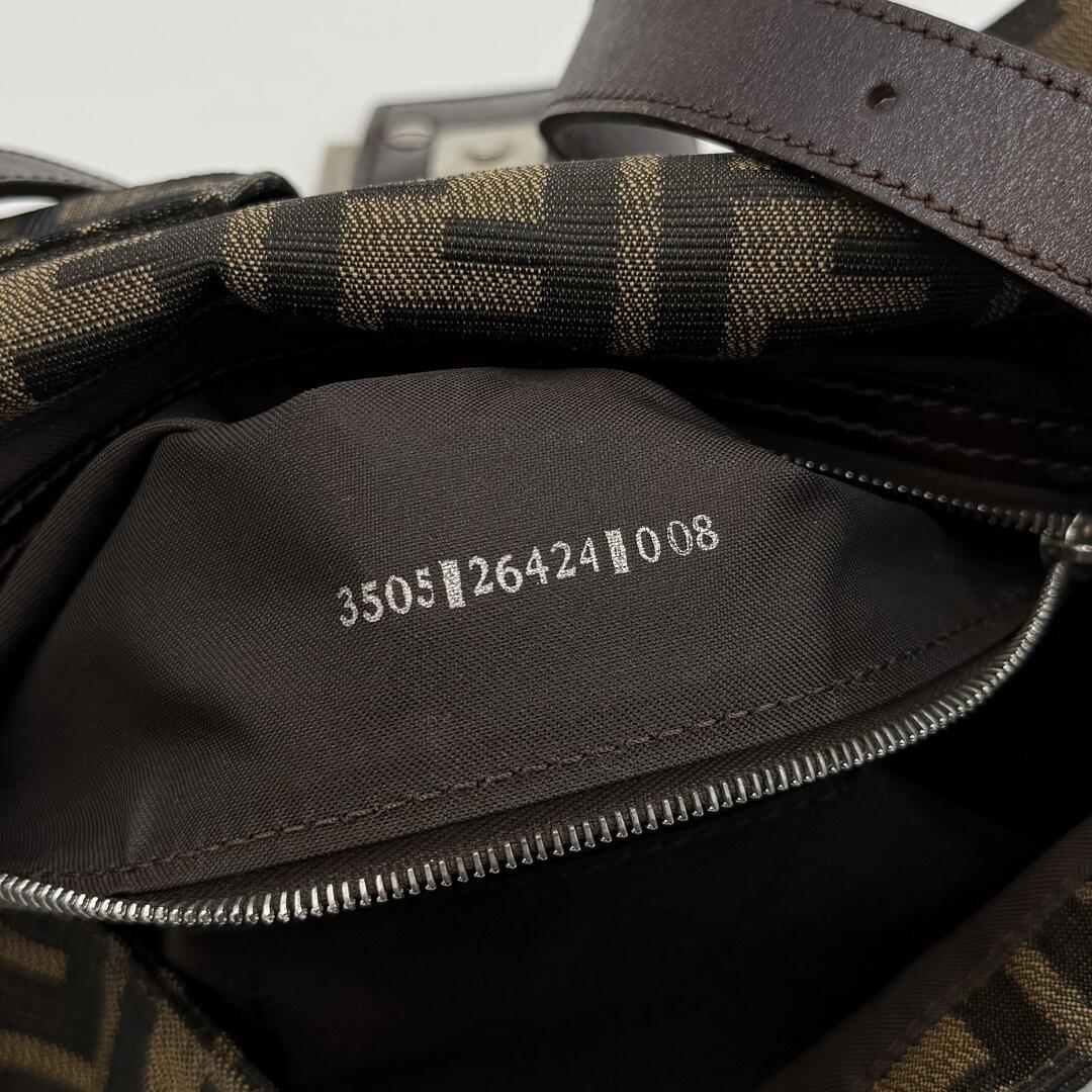 This Fendi Zucca Handbag features a black leather design with a convenient zip up compartment and interior zip pocket. The iconic Fendi Zucca monogram in black and green canvas adds a touch of luxury, complemented by stylish silver hardware engraved with the Fendi logo. Elevate your accessory game with this timeless piece.