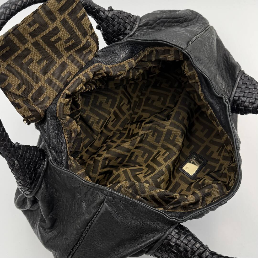 The Fendi Spy Black Handbag showcases the iconic monogram on black brown leather, combining timeless style with expert craftsmanship. Its silver Fendi engraving adds a subtle refined touch, while the buckle compartment offers both secure storage and sophisticated design. Perfect for those who appreciate classic luxury with practical functionality.