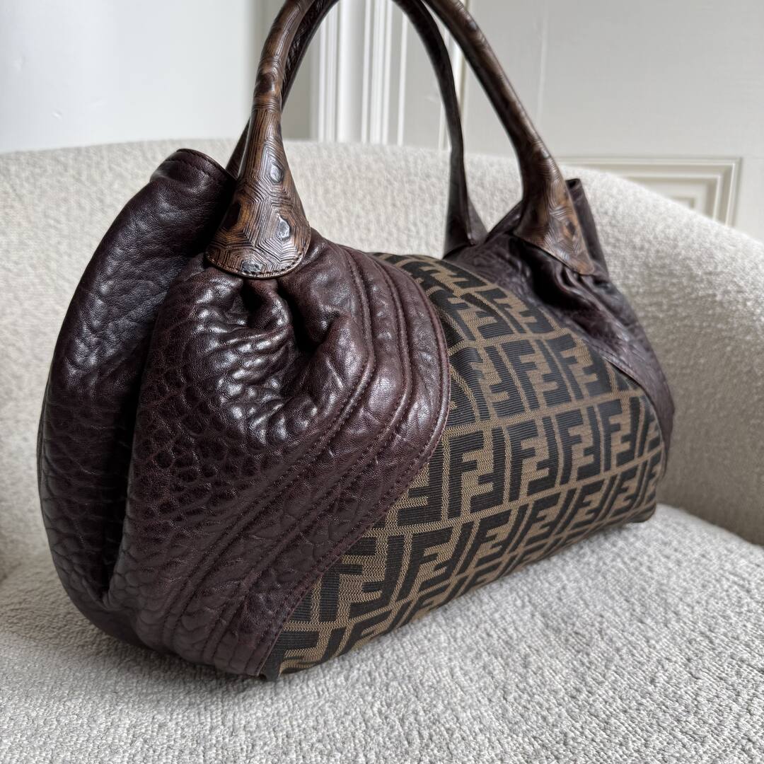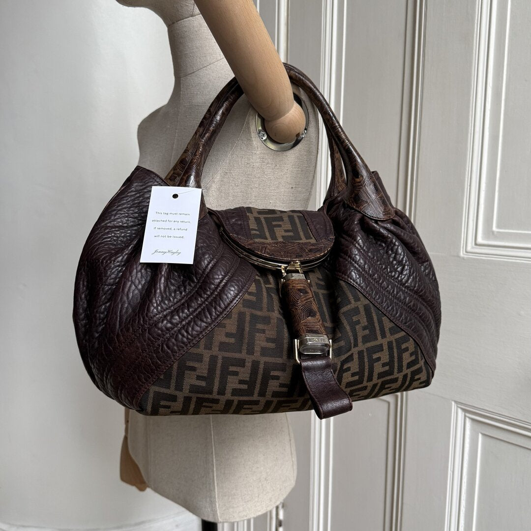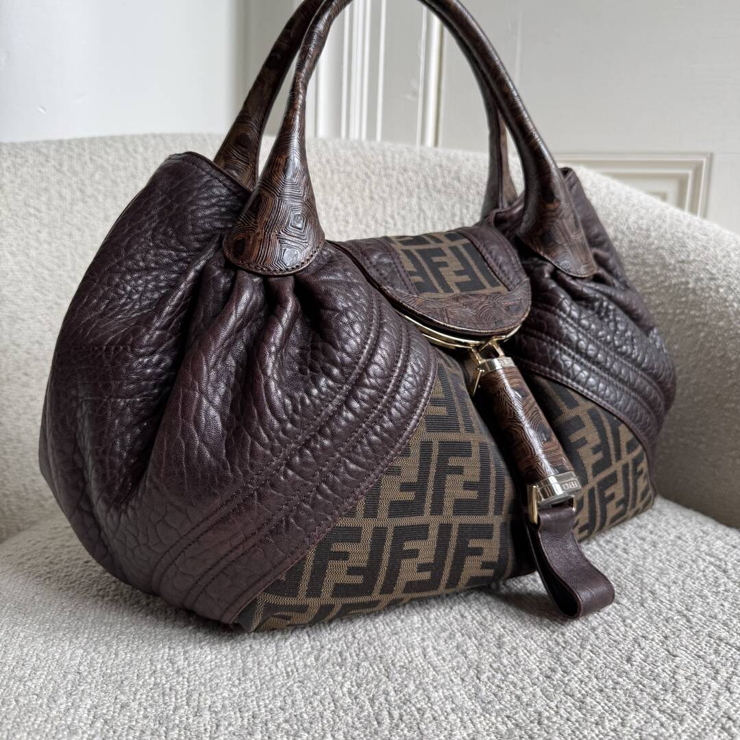 The Fendi Zucca Spy Brown Handbag showcases the iconic Zucca monogram on rich brown leather, combining timeless style with expert craftsmanship. Its silver Fendi engraving adds a subtle refined touch, while the buckle compartment offers both secure storage and sophisticated design. Perfect for those who appreciate classic luxury with practical functionality.
