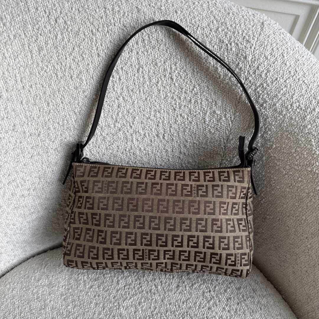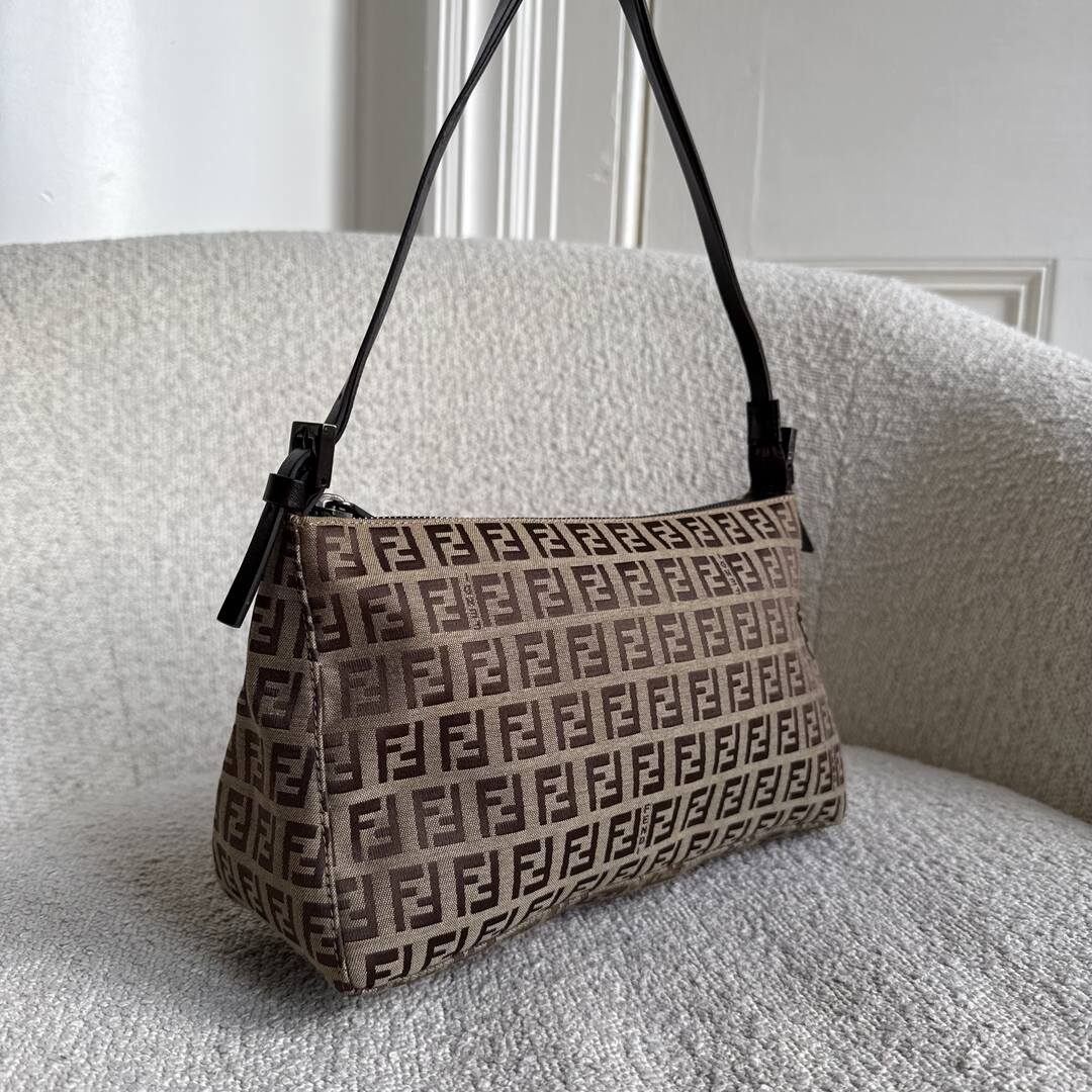 Crafted with the iconic Fendi FF zucchino monogram, this Brown Shoulder Bag is a must-have. The zip-up compartment offers convenient storage with an inner pocket for added organisation. Elevate your style with this timeless and versatile bag.