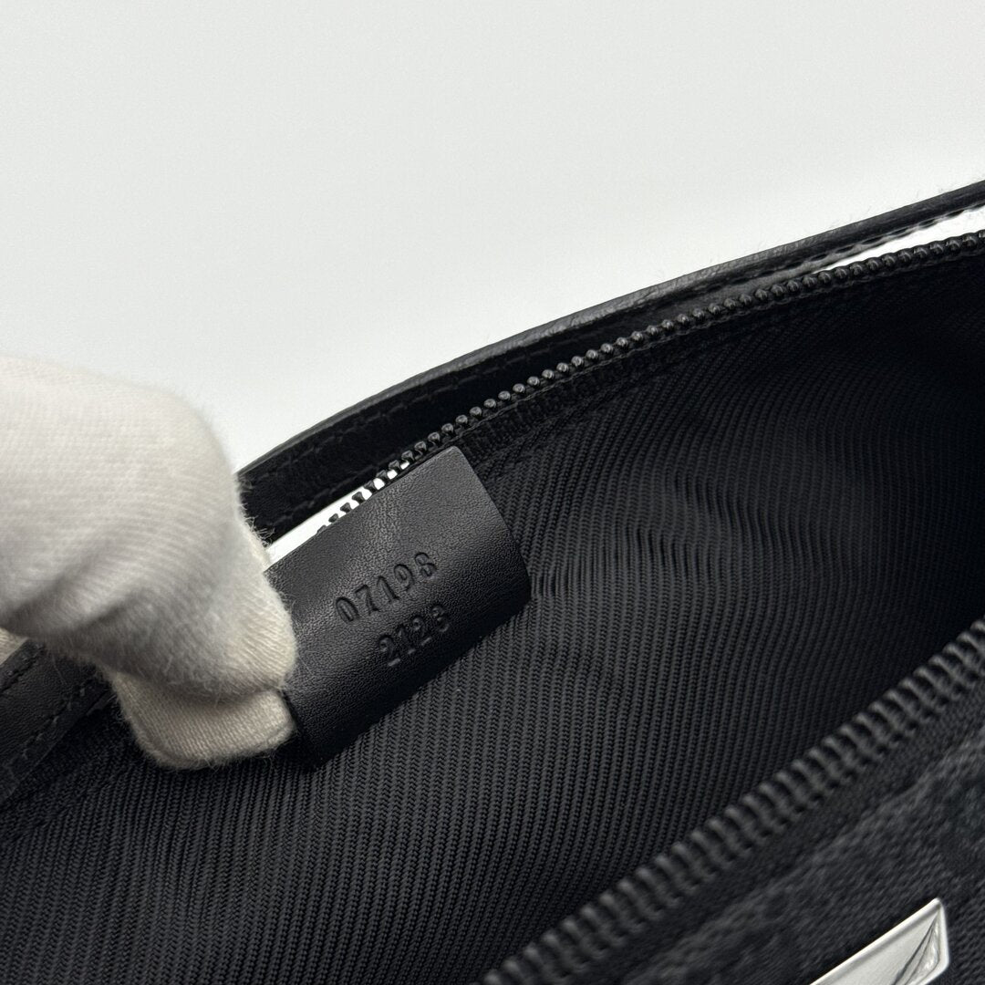 This Gucci Monogram Boat Pochette crafted with black leather and Gucci GG canvas, this bag features a convenient zip up compartment and a stylish silver Gucci engraved plaque on the front. Perfect to add a touch of elegance to your wardrobe.