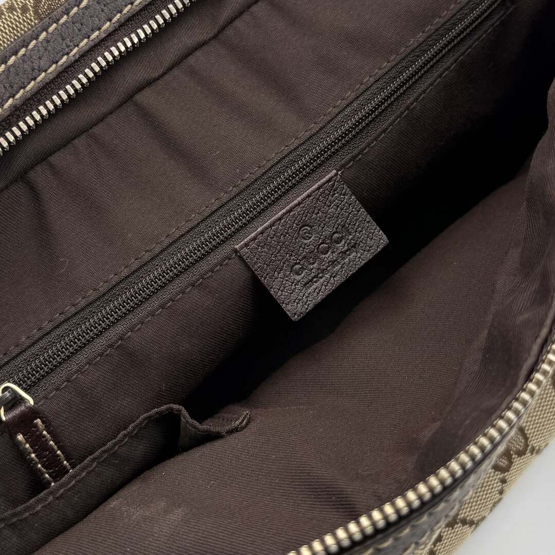 Effortlessly elevate your style with the Gucci GG Monogram Princy Brown Shoulder Bag. Made with GG beige canvas and brown leather, this bag exudes luxury. The zip up compartments and bow detailing with Gucci engraving on the bow add functionality and sophistication. Finished with gold hardware, it's a must-have.