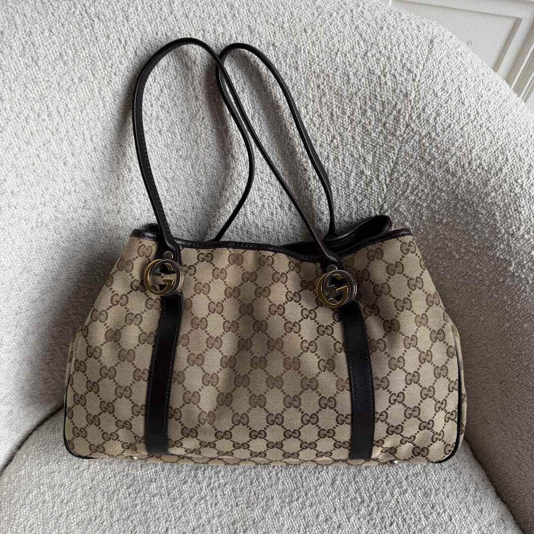 The Gucci GG Twins Black Leather Tote Bag. Crafted with black leather and featuring the iconic beige monogram, this bag exudes elegance. The silver interlocking G hardware adds a touch of sophistication. With an open top compartment and interior zip pocket, it offers both style and functionality.