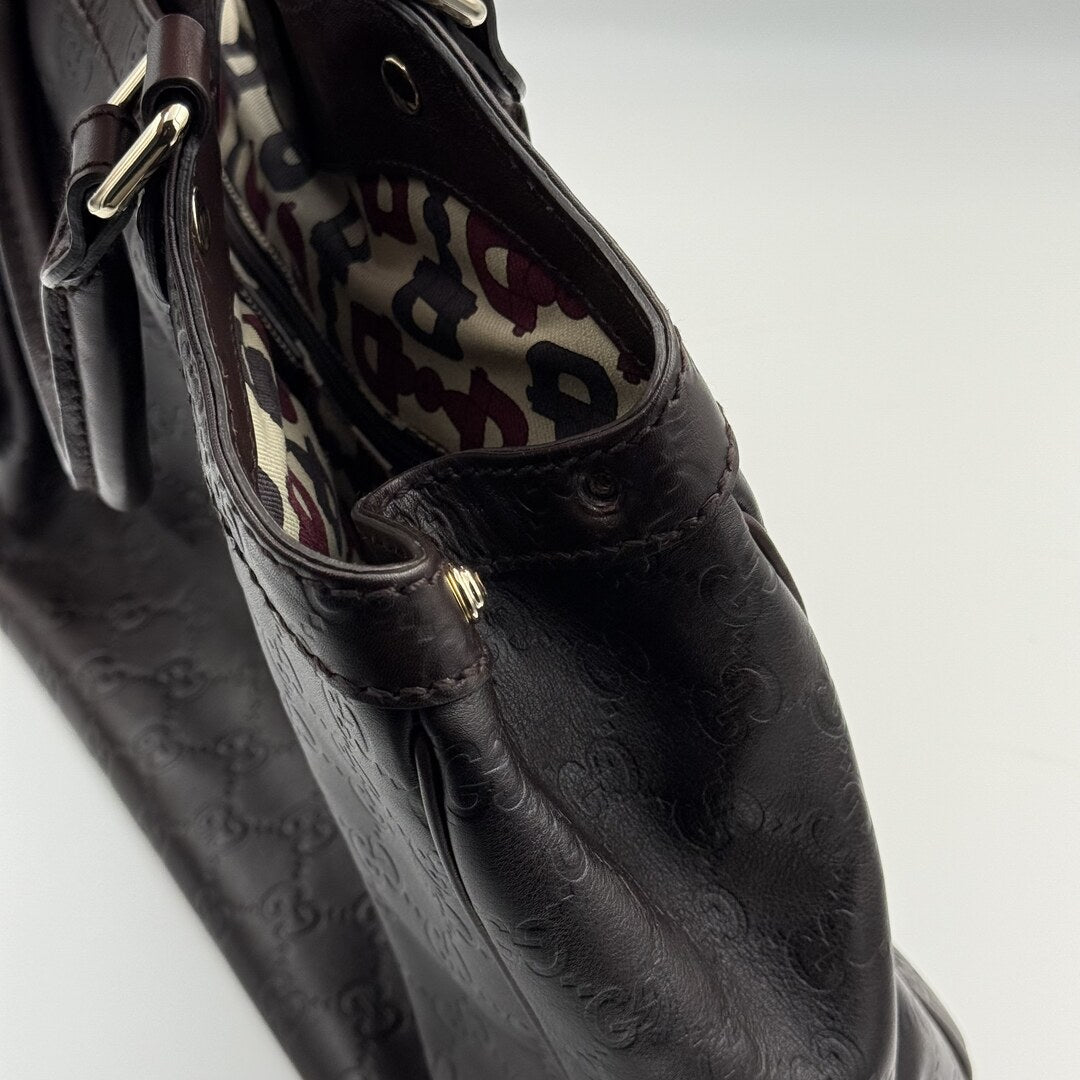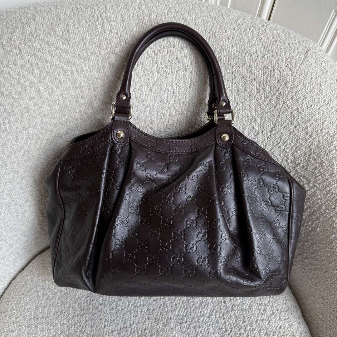 Expertly crafted from luxurious brown leather, the Gucci Sukey Tote Bag exudes elegance and sophistication. The iconic Guccissima GG pattern is displayed in brown, along with a silver interlocking G charm. With a magnetic compartment and a zip up pocket inside, this tote bag offers both style and functionality.
