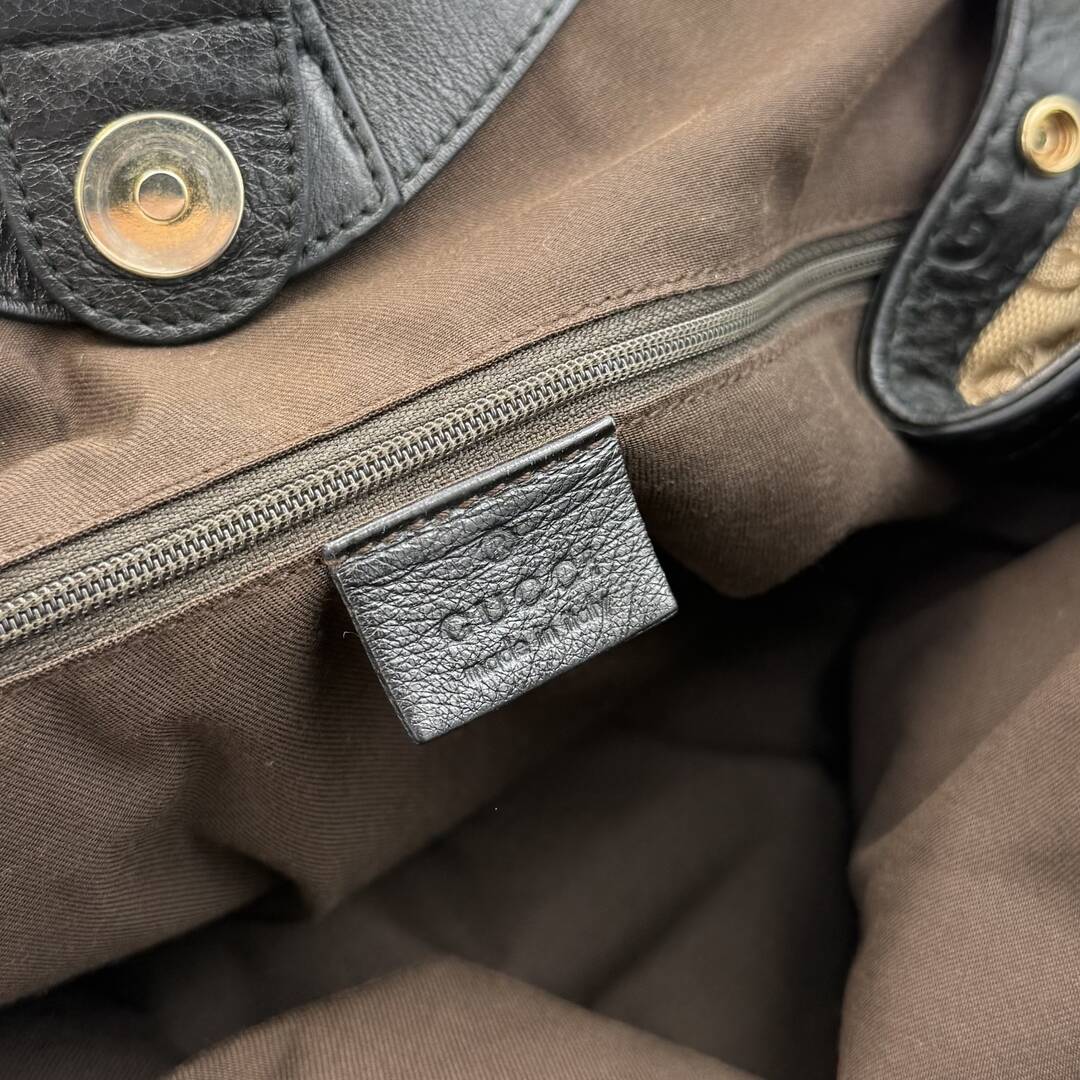 This Gucci Sukey GG Black Tote Bag is a stylish accessory made of GG monogram beige canvas with Guccissima black leather. Perfect for everyday use, it features a magnetic compartment with a zip up pocket inside. Gucci logo patch on the front for a touch of luxury. Expertly crafted by industry professionals, this tote bag is the perfect blend of chic and practicality.