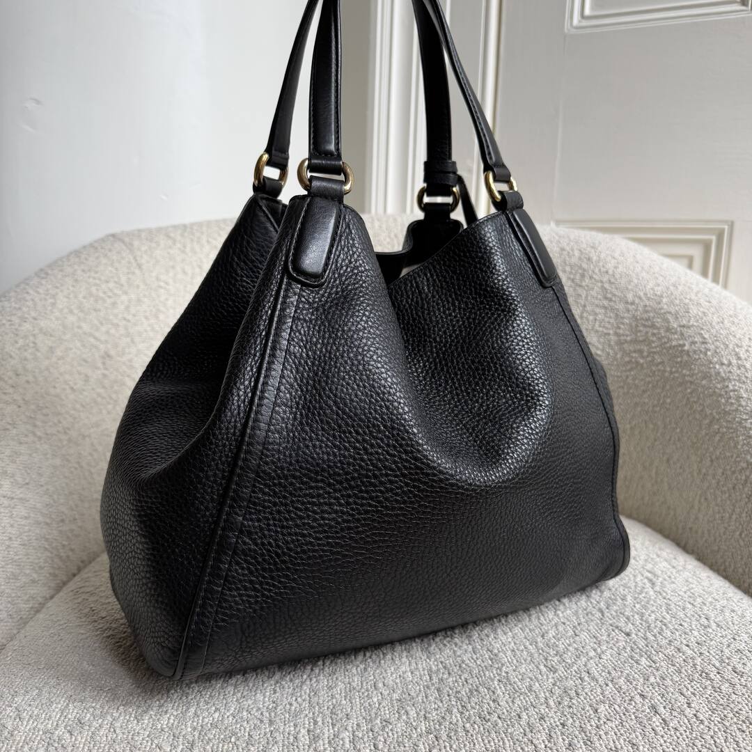 Constructed with sleek pebbled black leather and gold hardware, the Gucci Soho Leather Black Tote Bag exudes luxury and sophistication. Featuring an easy magnetic opening and a zippered pocket inside, this bag offers both style and functionality. Complete with the iconic GG embossed logo on the front, this bag is a must-have.
