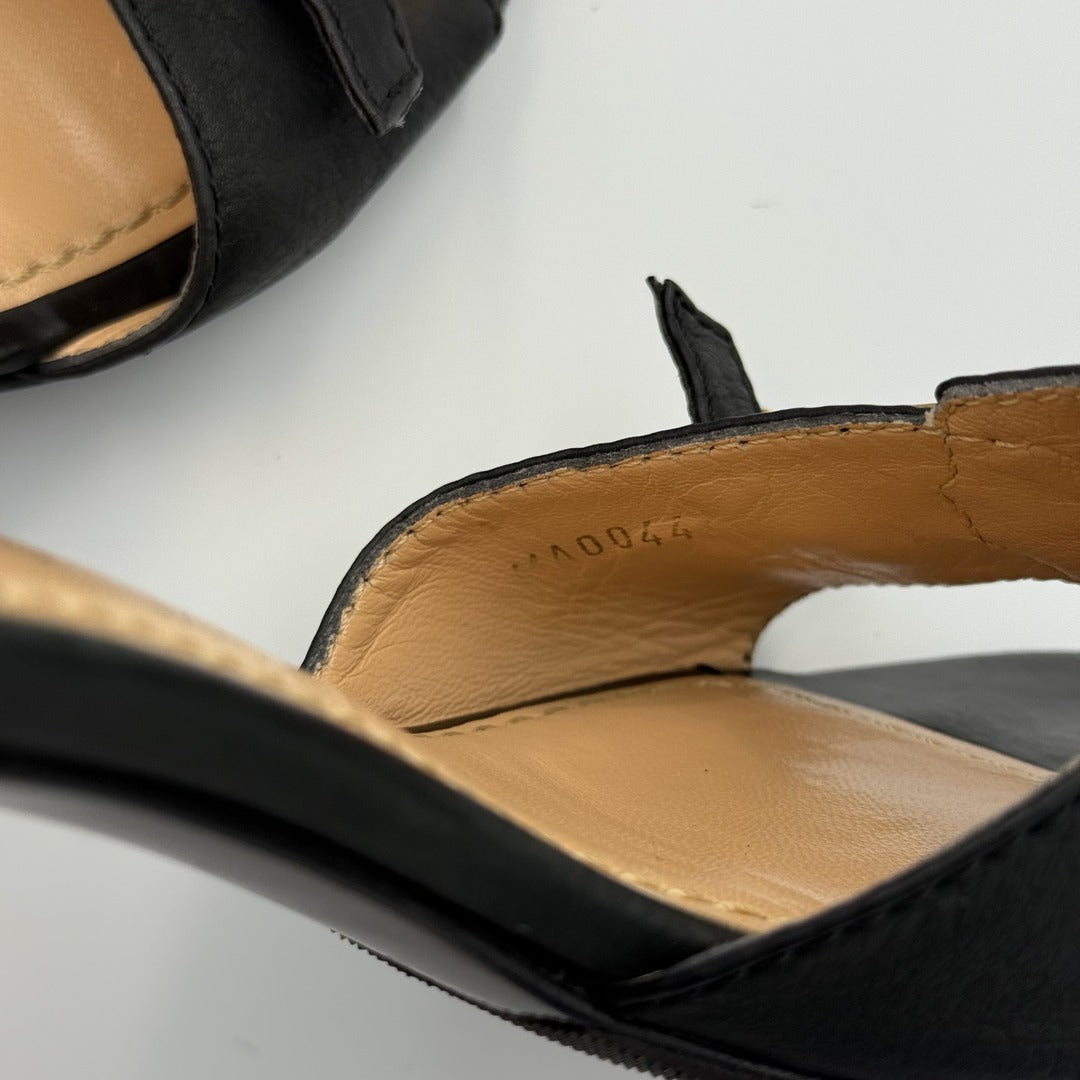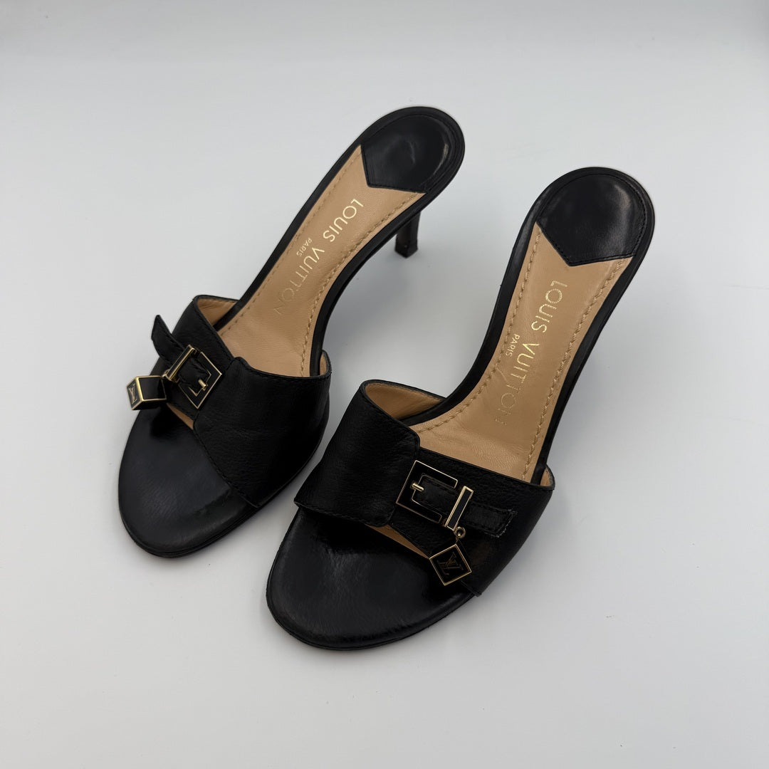 Elevate your footwear collection with these iconic Louis Vuitton Dice Black Leather Kitten Heels. Crafted from supple black leather, these sophisticated shoes feature an open-top silhouette that exudes contemporary elegance. The signature gold cube charm adorned with the LV logo engraving adds a distinctive luxury touch.