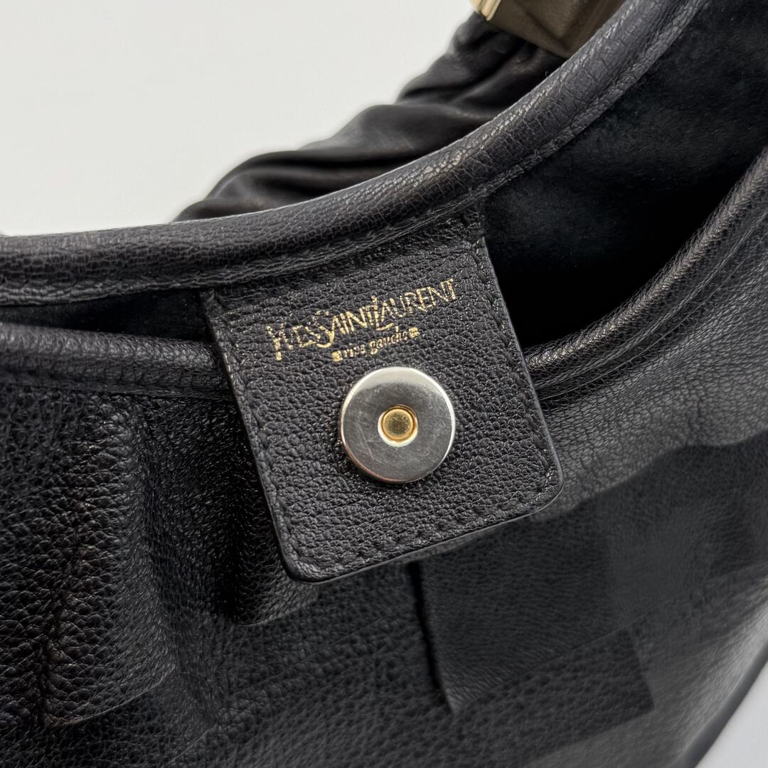 This YSL Saint Tropez Leather Black Shoulder Bag features a chic ruffled design, crafted with black leather and gold hardware. The magnetic compartment and zip up pocket inside provide convenient storage for your essentials. Elevate your style with the iconic YSL logo on the front.